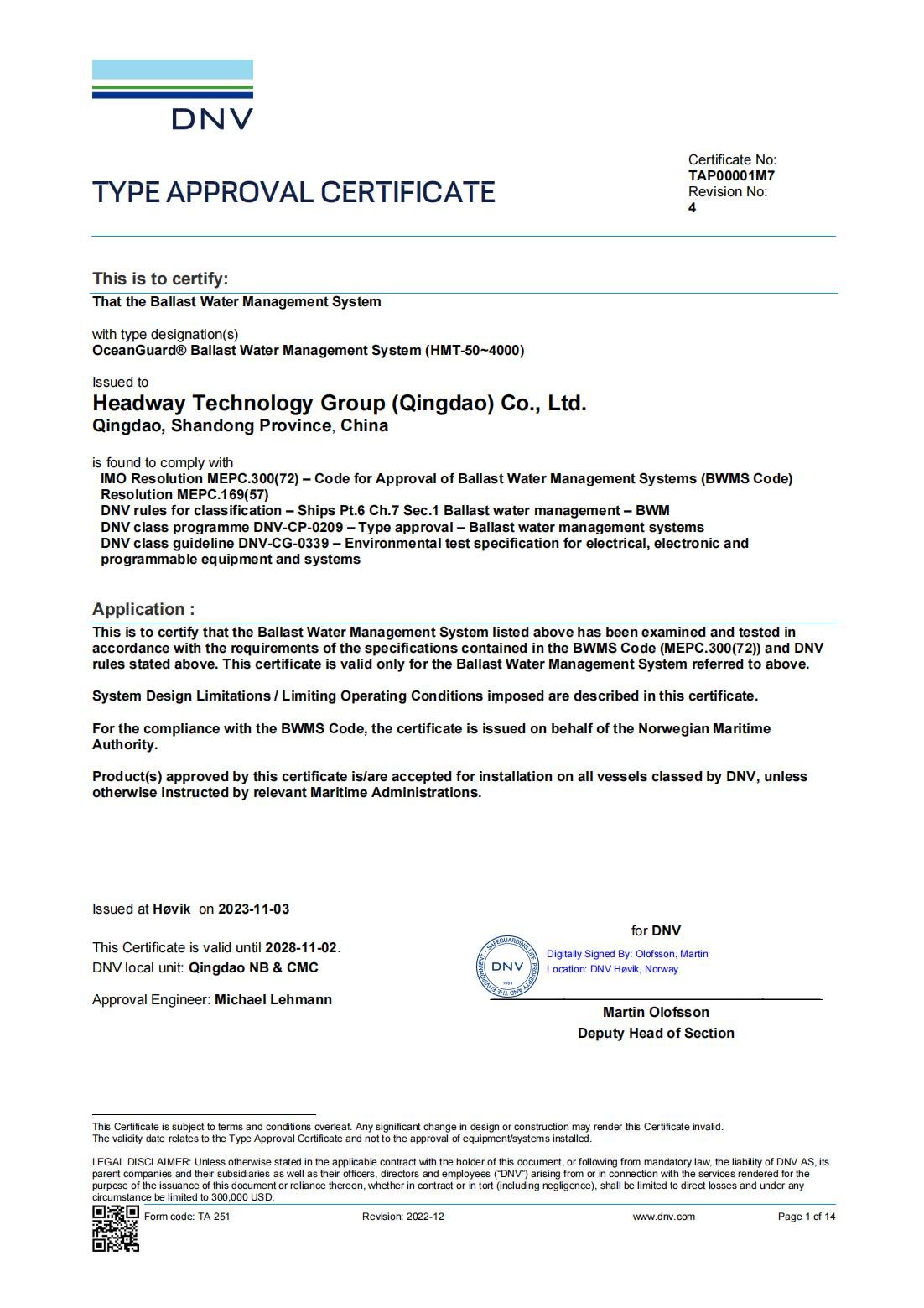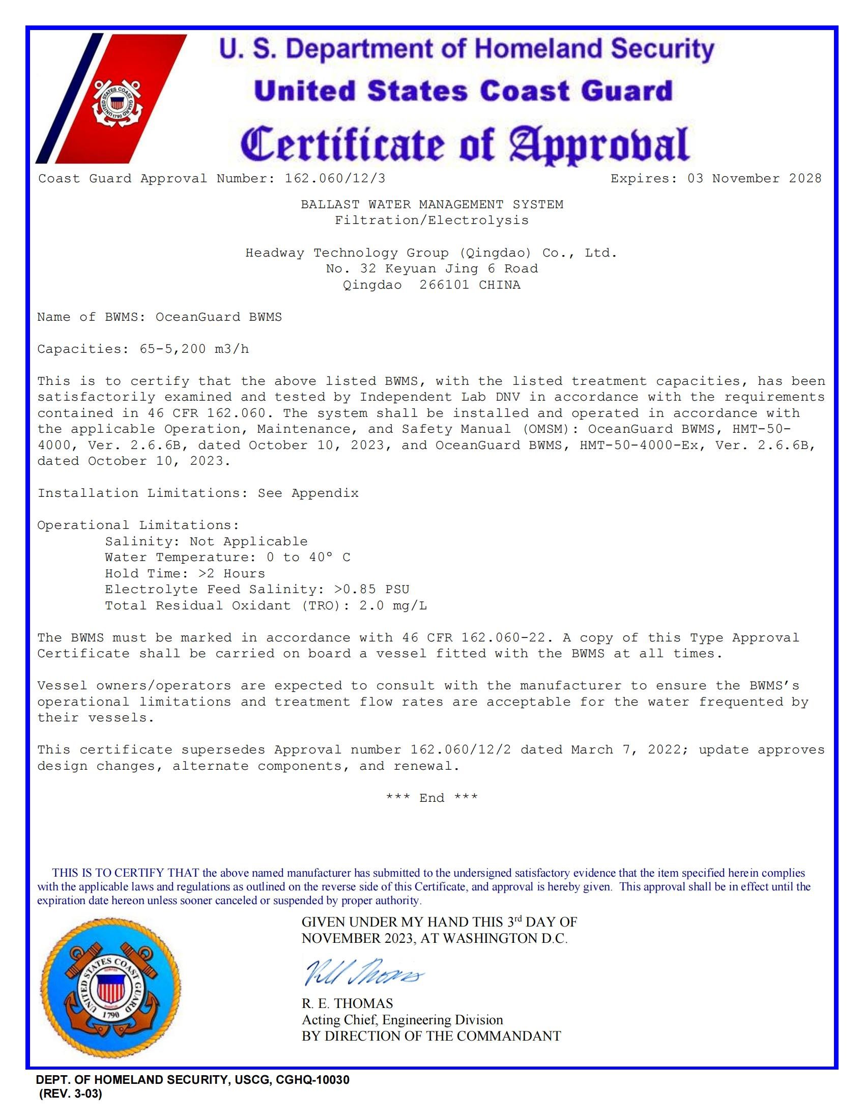 IMO BWMS Code 型式认可证书