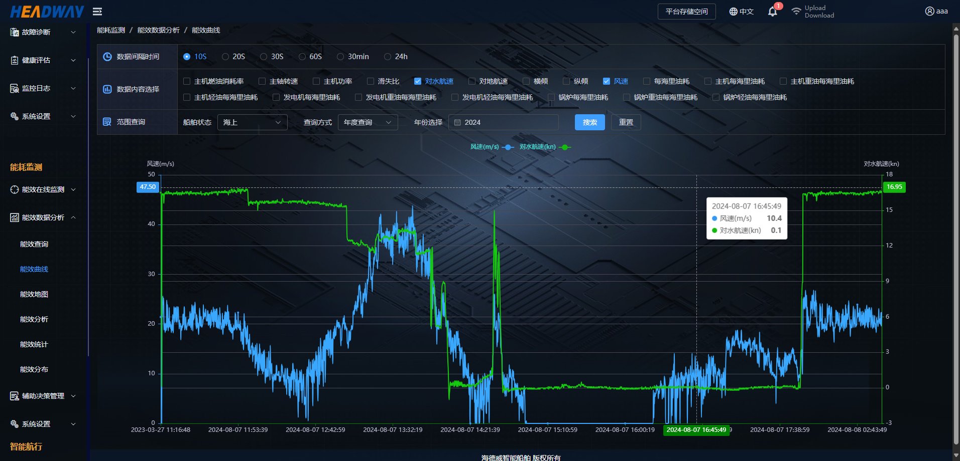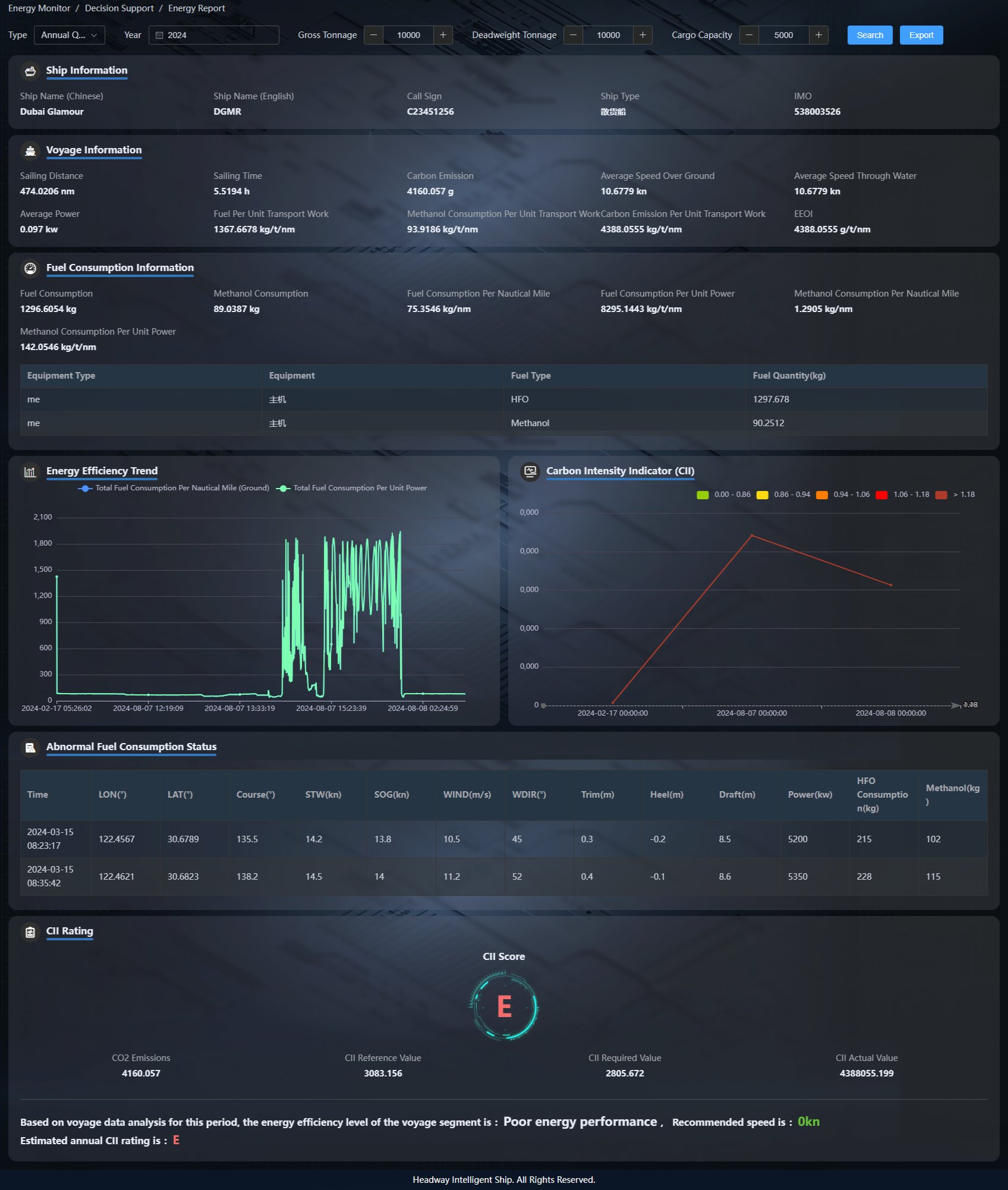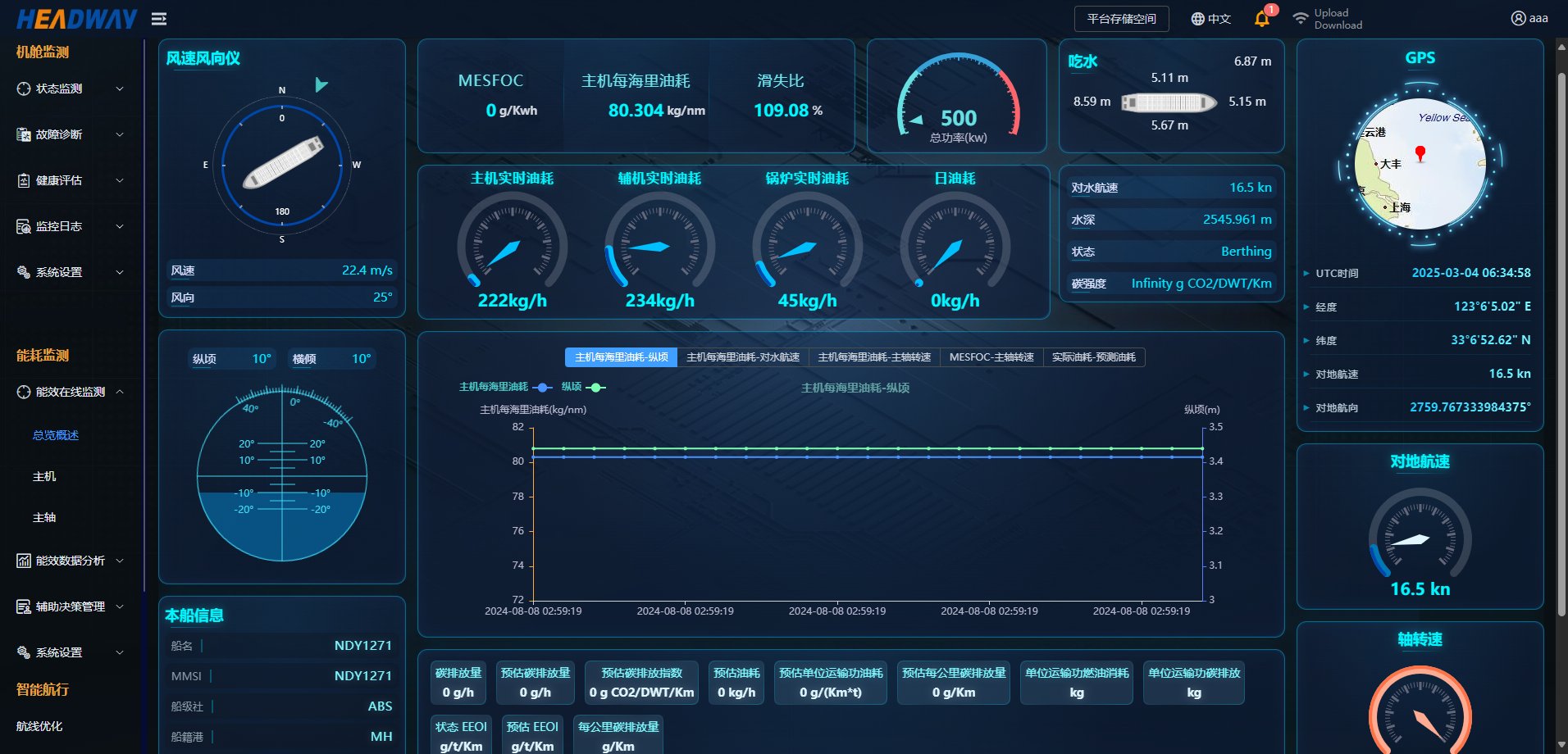 基于智能信息集成平台,实时监测船舶航行各个关键指标,运用现代化船舶能效管理的系统性方法,对船舶能源消耗、能源利用效率和二氧化碳排放进行严格的控制和管理,提高船舶能效,减少设备自身或人为因素造成的额外消耗,实现船舶节能减排的能效要求,推动航运绿色发展。